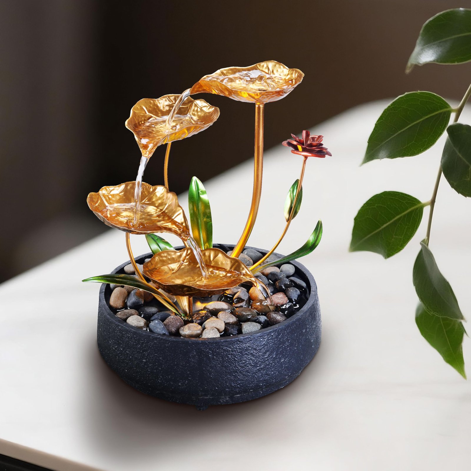 - Elegant Tabletop Fountain Design – Featuring a beautifully crafted golden metal lotus design, this small water fountain adds a sophisticated accent to any space.
